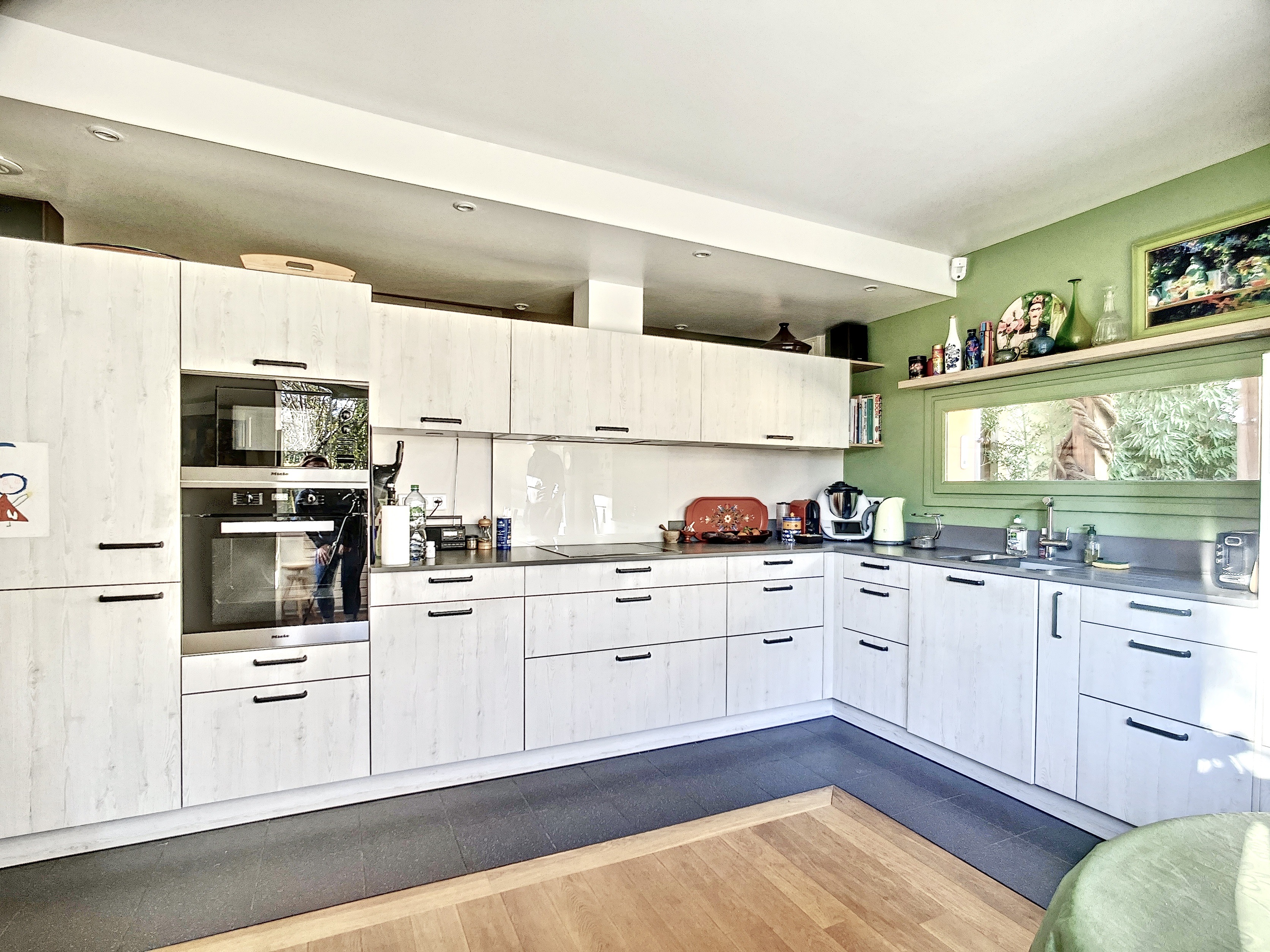 Au rez-de-chaussée, la maison se compose d’une entrée avec des placards débouchant sur un vaste séjour cathédrale de 34 m2 avec du parquet huilé massif et une cheminée, d’un salon de lecture, d’une cuisine moderne et équipée refaite récemment, disposant d’un agréable espace salle à manger sous bow-window. Toutes ces pièces disposent d’une vue dégagée sur le jardin. Ce niveau comporte également une buanderie et des toilettes invités.